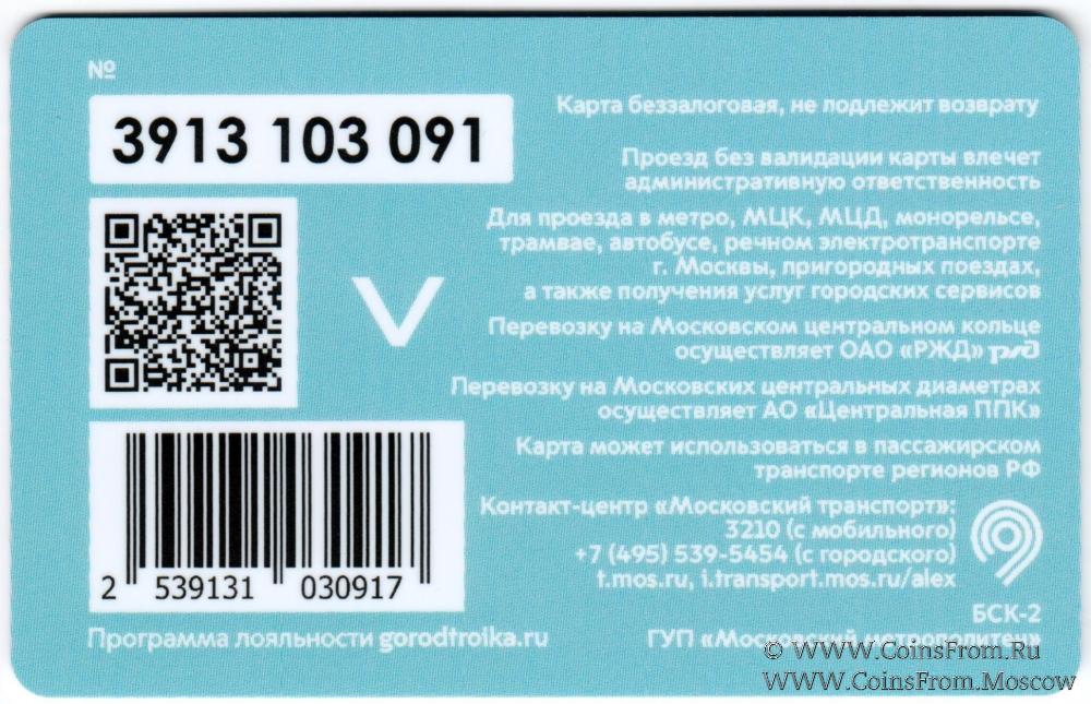 Карта беззалоговая (№ 3913), не подлежит возврату. Проезд без валидации карты влечет административную ответственность. Для проезда в метро, МЦК, МЦД, монорельсе, трамвае, автобусе г. Москвы, пригородных поездах, а также получения услуг городских сервисов.