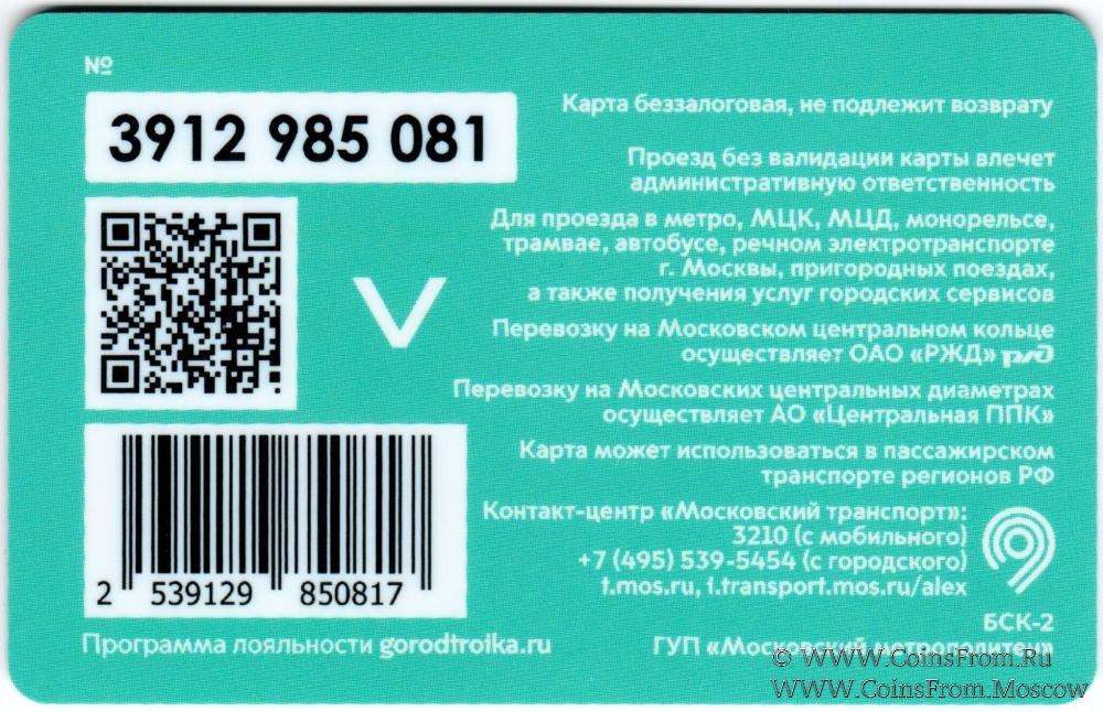 Карта беззалоговая (№ 3912), не подлежит возврату. Проезд без валидации карты влечет административную ответственность. Для проезда в метро, МЦК, МЦД, монорельсе, трамвае, автобусе г. Москвы, пригородных поездах, а также получения услуг городских сервисов.