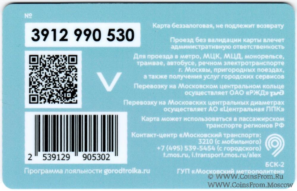 Карта беззалоговая (№ 3912), не подлежит возврату. Проезд без валидации карты влечет административную ответственность. Для проезда в метро, МЦК, МЦД, монорельсе, трамвае, автобусе г. Москвы, пригородных поездах, а также получения услуг городских сервисов.
