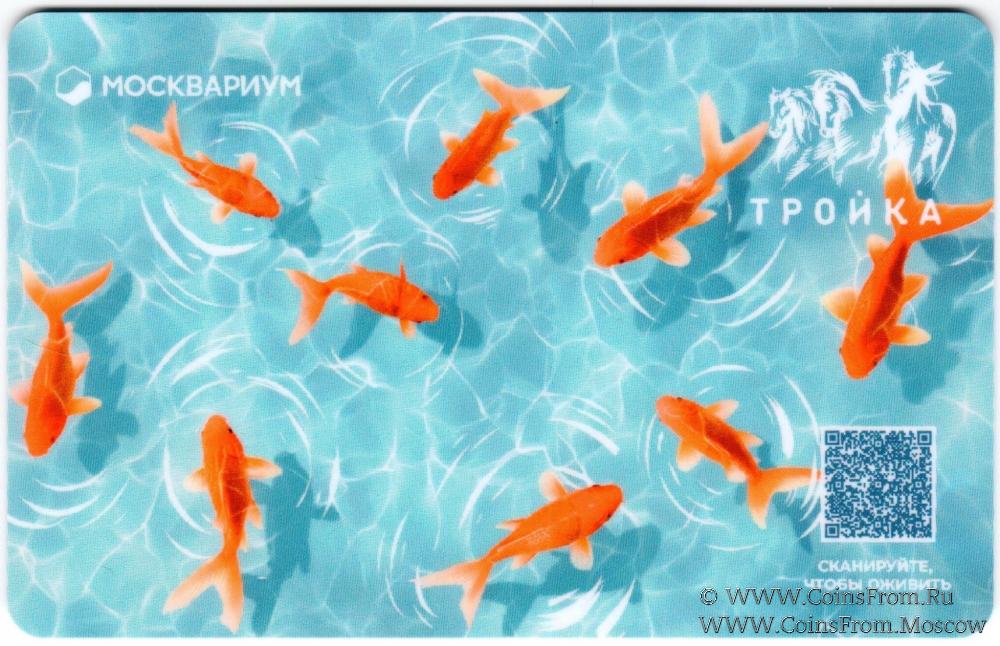 Электронная транспортная карта "Тройка". Размер: 85,5 * 54 мм. Карта "Тройка" выпущена совместно с "Москвариумом". Серия из 3-х карт: карпы кои (вариант 4.1.1.). На каждой из карт расположен QR-код, который позволяет оживить изображения животных.