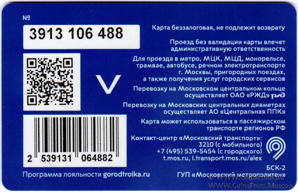 Карта беззалоговая (3913), не подлежит возврату. Проезд без валидации карты влечет административную ответственность. Для проезда в метро, МЦК, МЦД, монорельсе, трамвае, автобусе, речном электротранспоре г. Москвы, пригородных поездах, а также получения услуг городских сервисов.