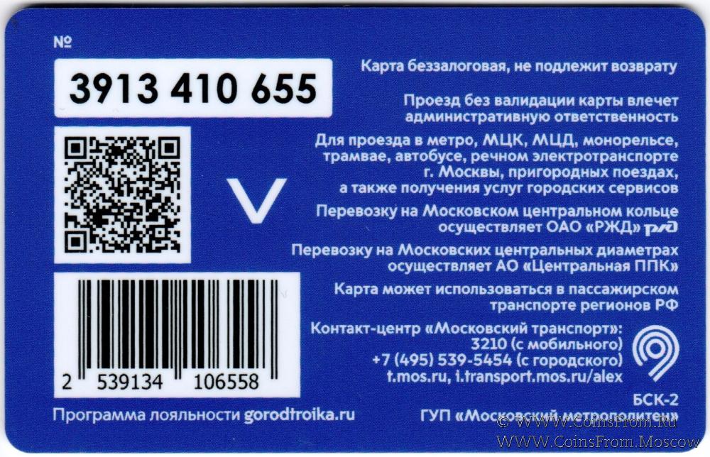 Карта сувенирная (3913) беззалоговая, не подлежит возврату. Проезд без валидации карты влечет административную ответственность. Для проезда в метро, МЦК, МЦД, монорельсе, трамвае, автобусе, речном электротранспорте г. Москвы, пригородных поездах, а также получения услуг городских сервисов.