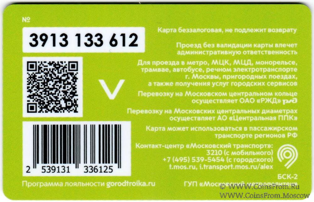 Карта беззалоговая (3913), не подлежит возврату. Проезд без валидации карты влечет административную ответственность. Для проезда в метро, МЦК, МЦД, монорельсе, трамвае, автобусе, речном электротранспоре г. Москвы, пригородных поездах, а также получения услуг городских сервисов.