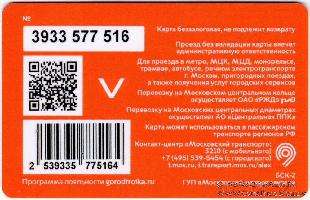 Карта беззалоговая (3933), не подлежит возврату. Проезд без валидации карты влечет административную ответственность. Для проезда в метро, МЦК, МЦД, монорельсе, трамвае, автобусе, речном электротранспорте г. Москвы, пригородных поездах, а также получения услуг городских сервисов.