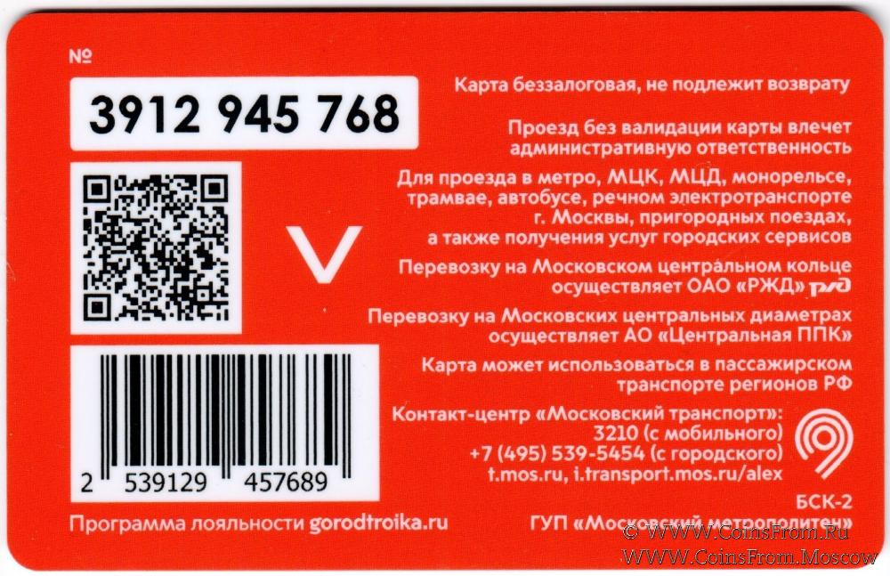 Карта беззалоговая (3912), не подлежит возврату. Проезд без валидации карты влечет административную ответственность. Для проезда в метро, МЦК, МЦД, монорельсе, трамвае, автобусе, речном электротранспорте г. Москвы, пригородных поездах, а также получения услуг городских сервисов.