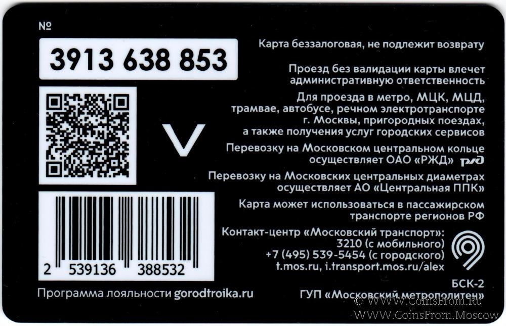 Карта сувенирная (3913) беззалоговая, не подлежит возврату. Проезд без валидации карты влечет административную ответственность. Для проезда в метро, МЦК, МЦД, трамвае, автобусе, речном электротранспорте г. Москвы, пригородных поездах, а также получения услуг городских сервисов.